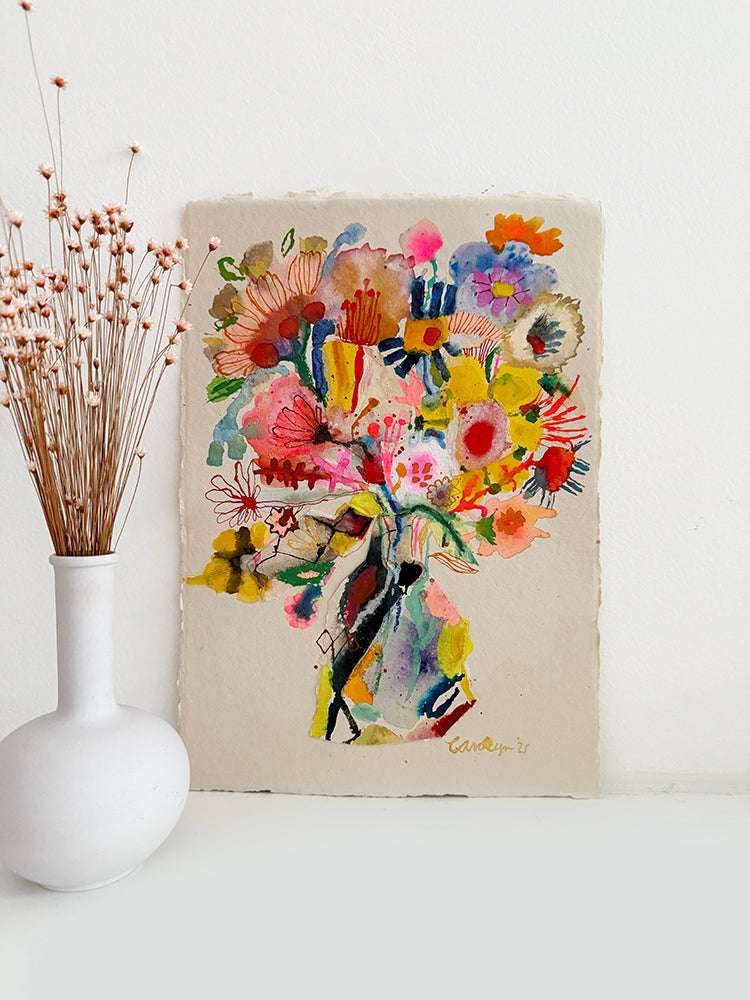 An ongoing series of collage, paint and paper. Torn paper from abstract paintings become vases, flowers and graphic shapes. My love of this medium is endless and shines through with a mix of metallic watercolour, gouache, paper, pigment and pen and ink line work.