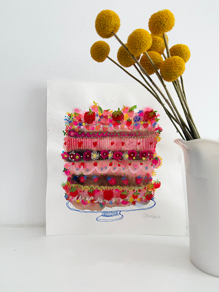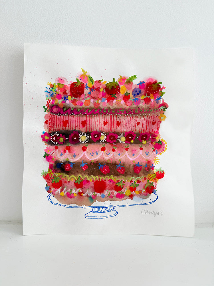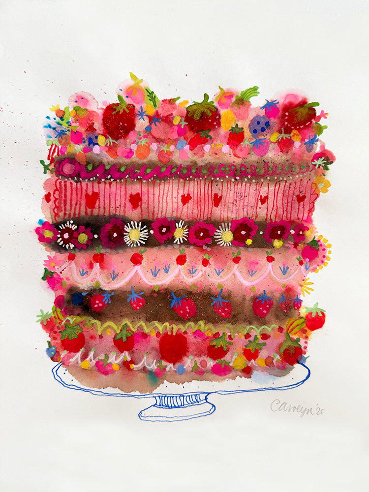 Two of my favourite ingredients in this delicious and oh so dramatic Strawberry Chocolate surprise. With seasonal berries and organic chocolate. Made with love and lots of sweetness. With watercolour, gouache, neon and pen and ink.