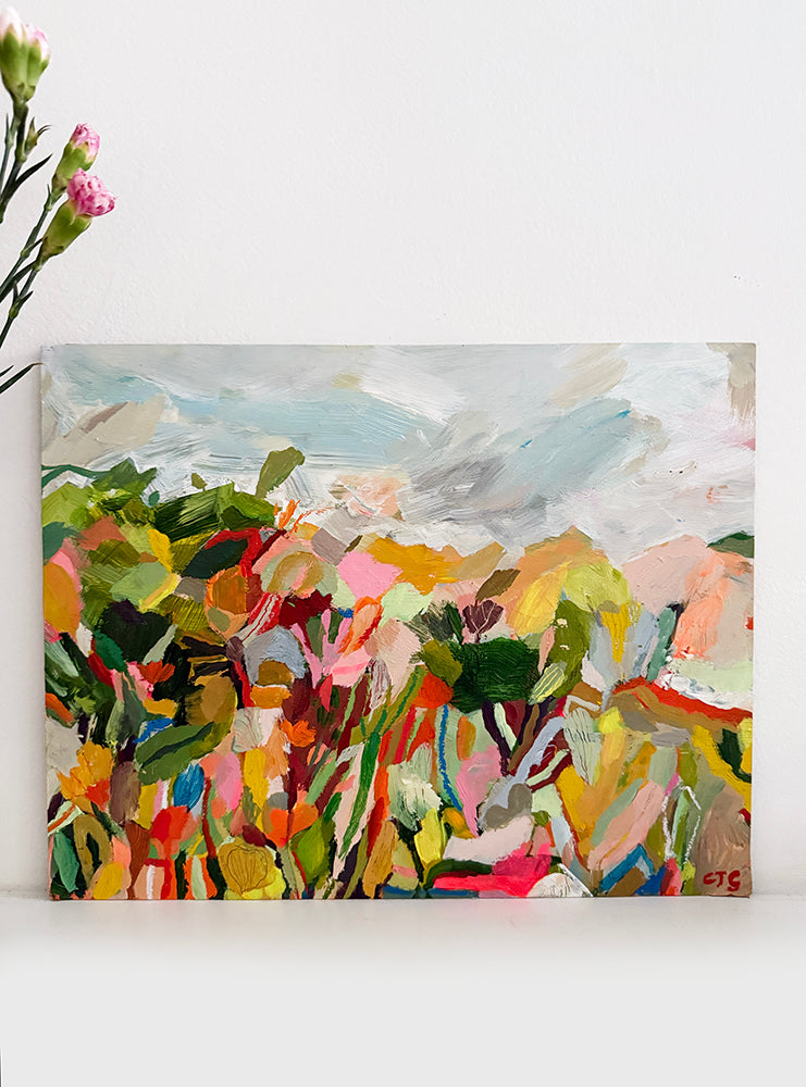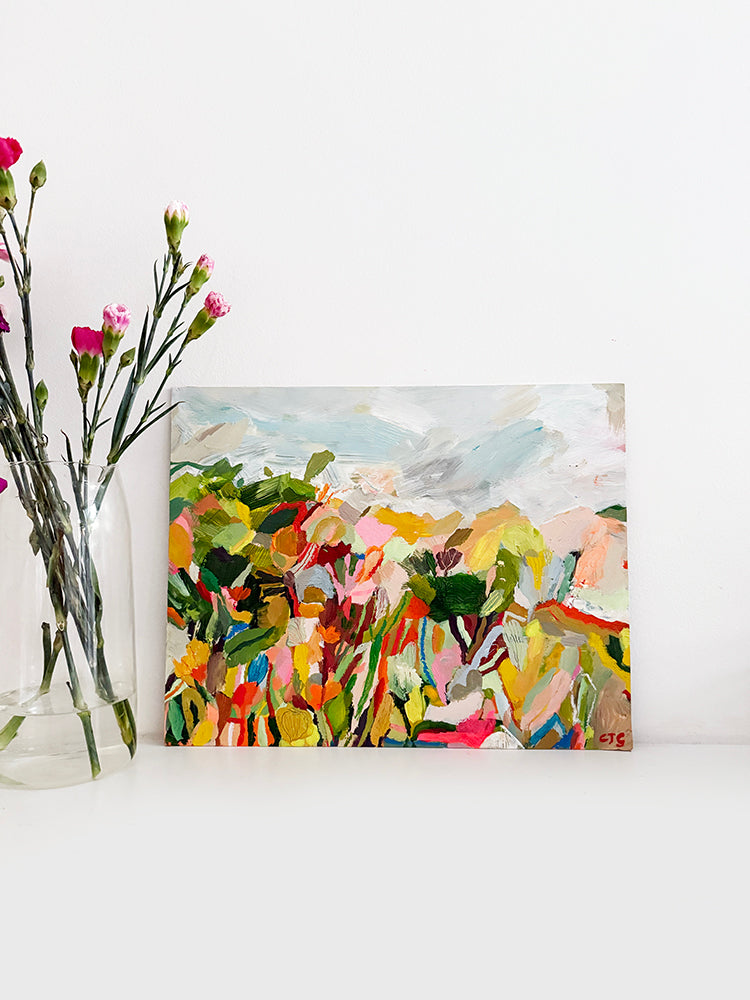 Hues of mustard, blue, green, pale pinks and neon red with a hit of delicate line, all work harmoniously together. An organic softness with brights make this such a fun piece for any home.