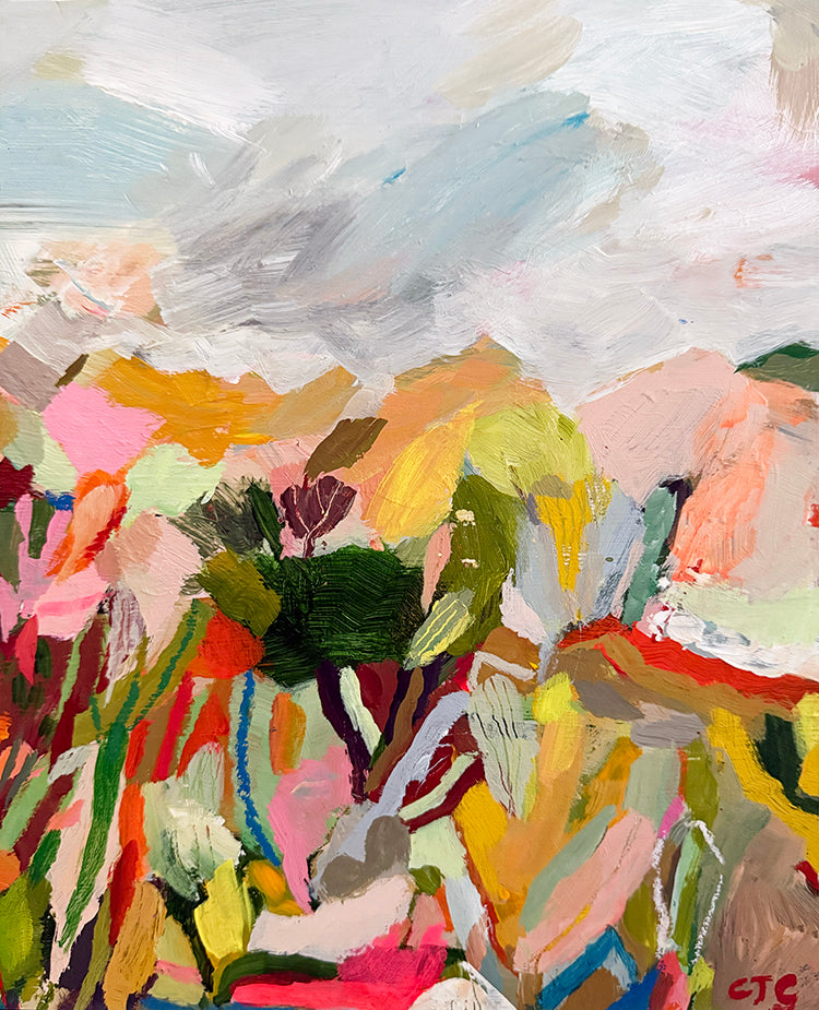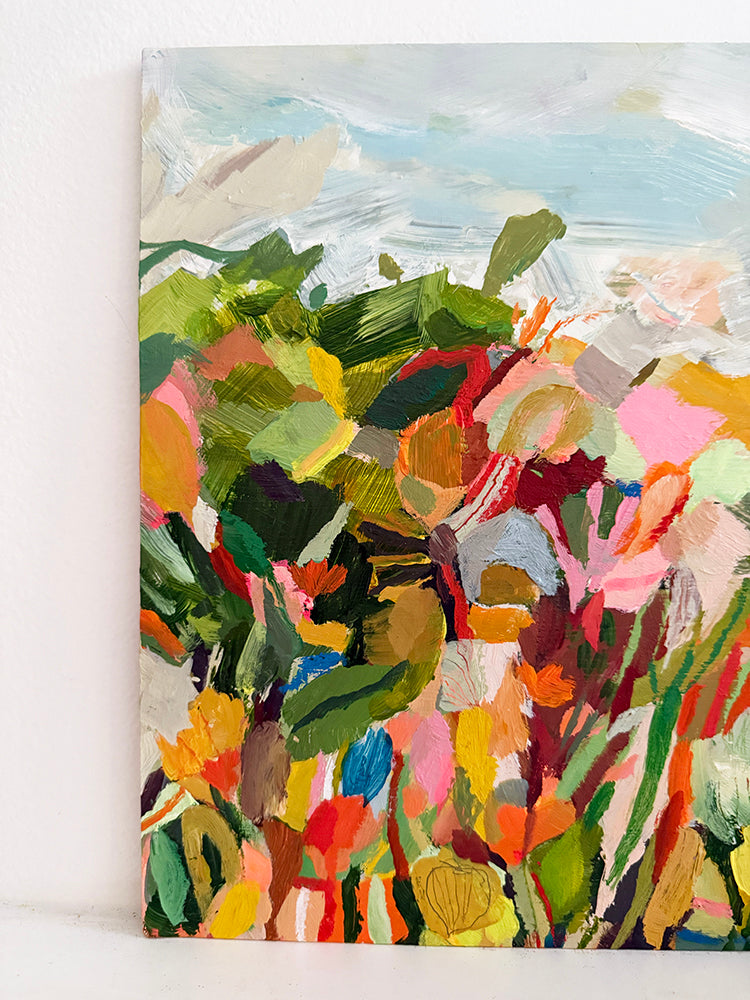 An original acryla gouache and acrylic abstract landscape. Take a wander through this earthy path with trees of green and skies of blue.