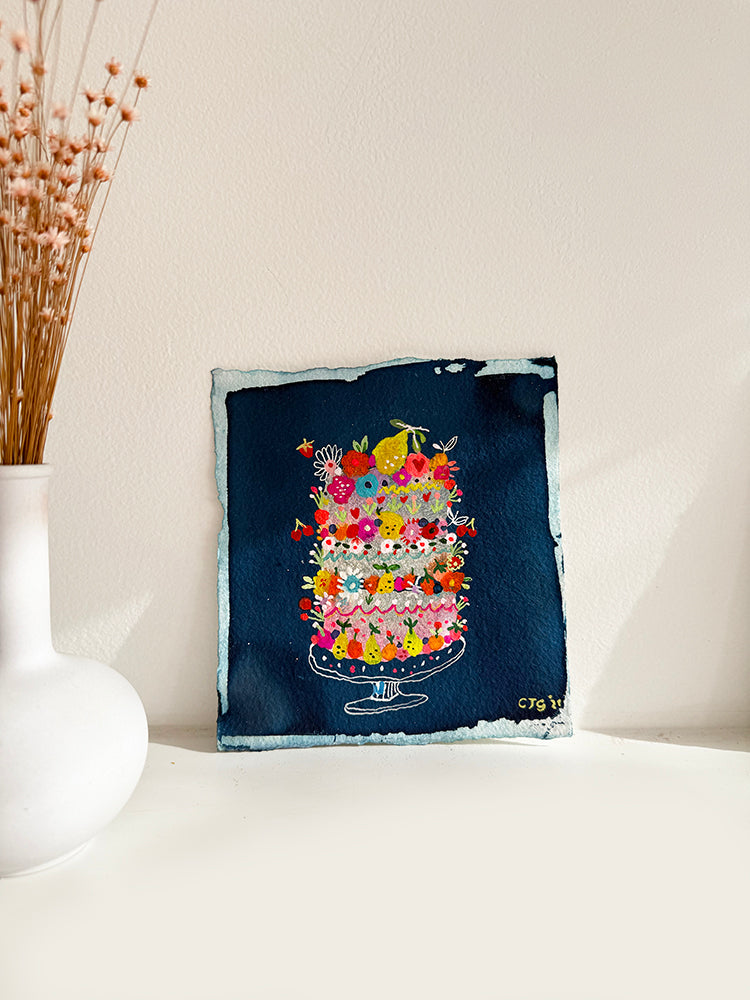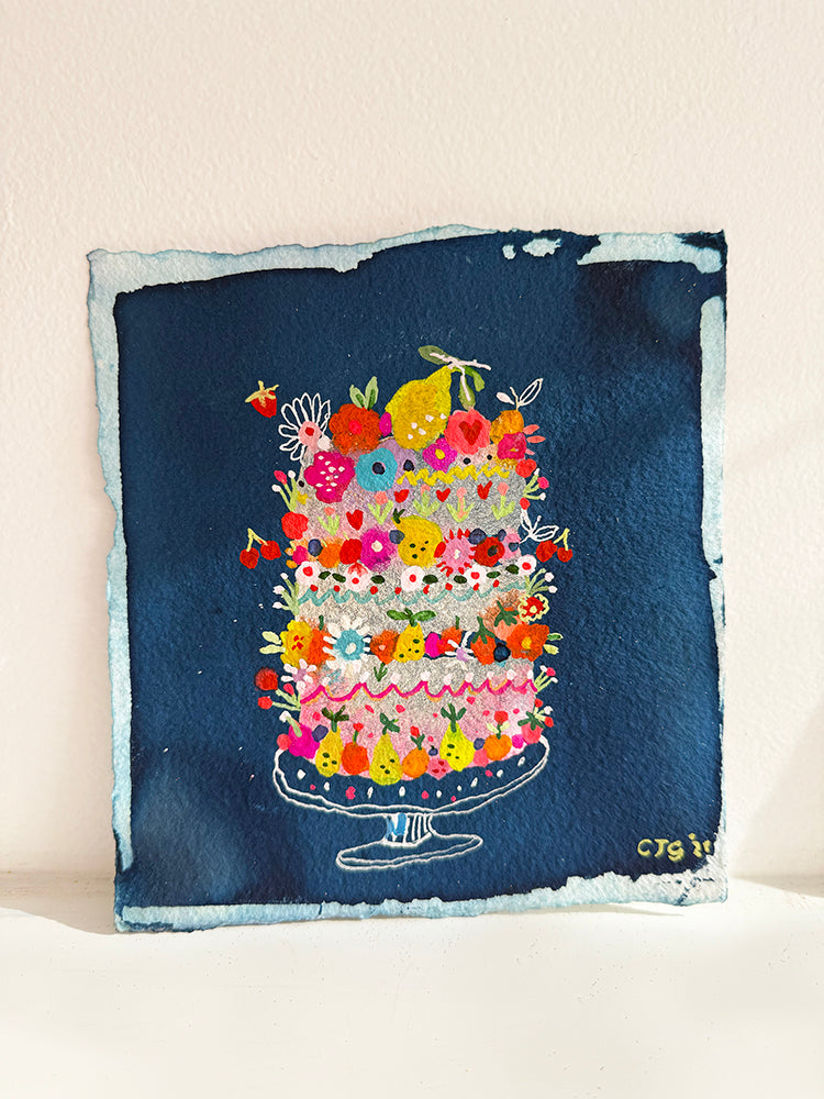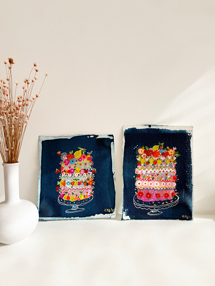 These tiny but majestic mini's are painted on a deep Prussian original Cyanotype print. Using handmade paper, watercolour, gouache, neon and pen and ink. Reminiscent of Indigo, they ooze charm and bold flavour. Yummy and fun!