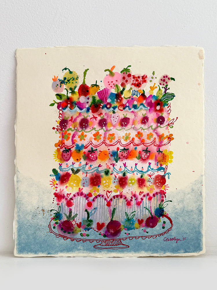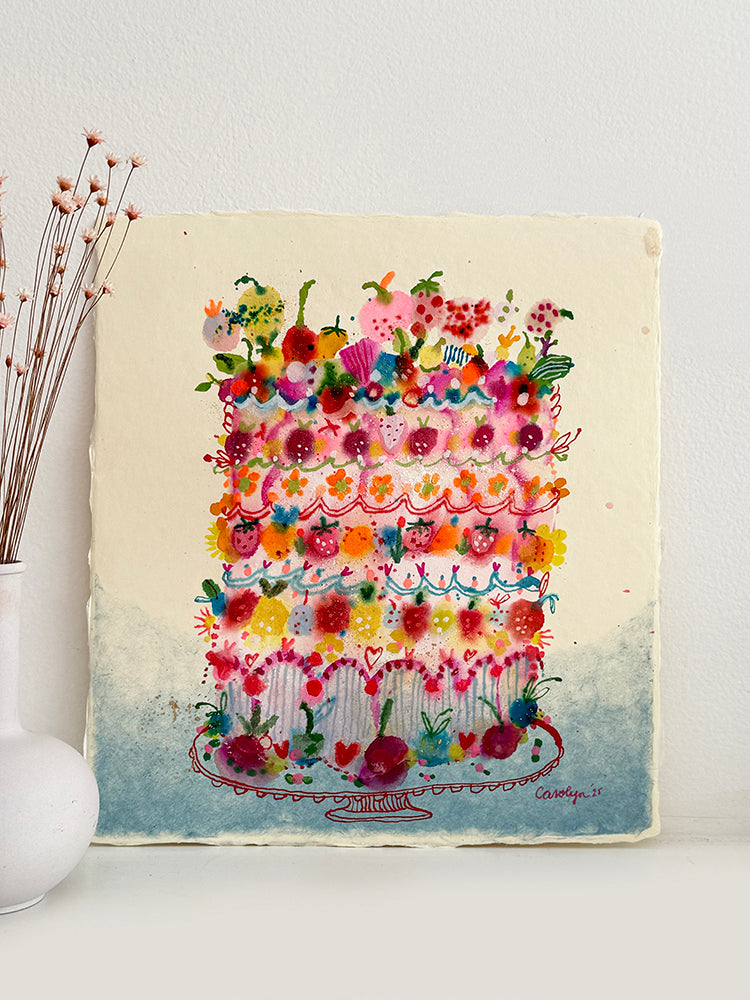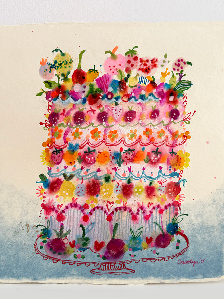 Layers of Meringue infused with Rosewater, melt in your mouth deliciously decadent 6 layer Pavlova. Raspberry, Cherry, blueberry topping tops it off and is the icing on the cake. Baked with love, watercolour, gouache, neon and pen and ink.
