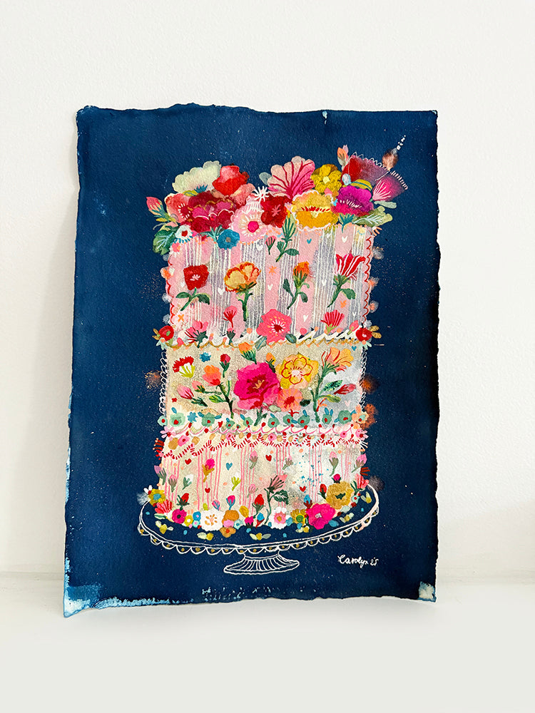 Using Arches cold press archival watercolour paper dipped in Cyanotype to make the deepest of Indigo blues for the background. With gouache, neon and pen and ink.